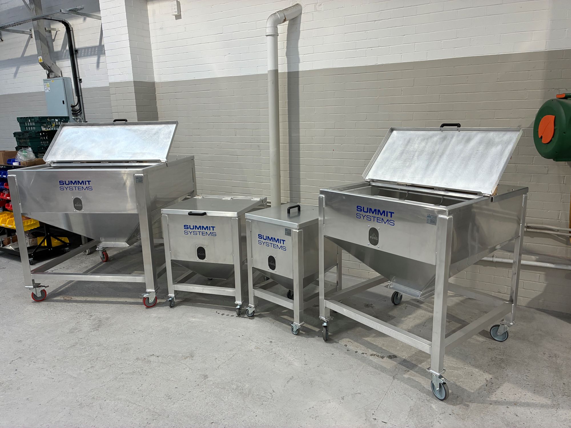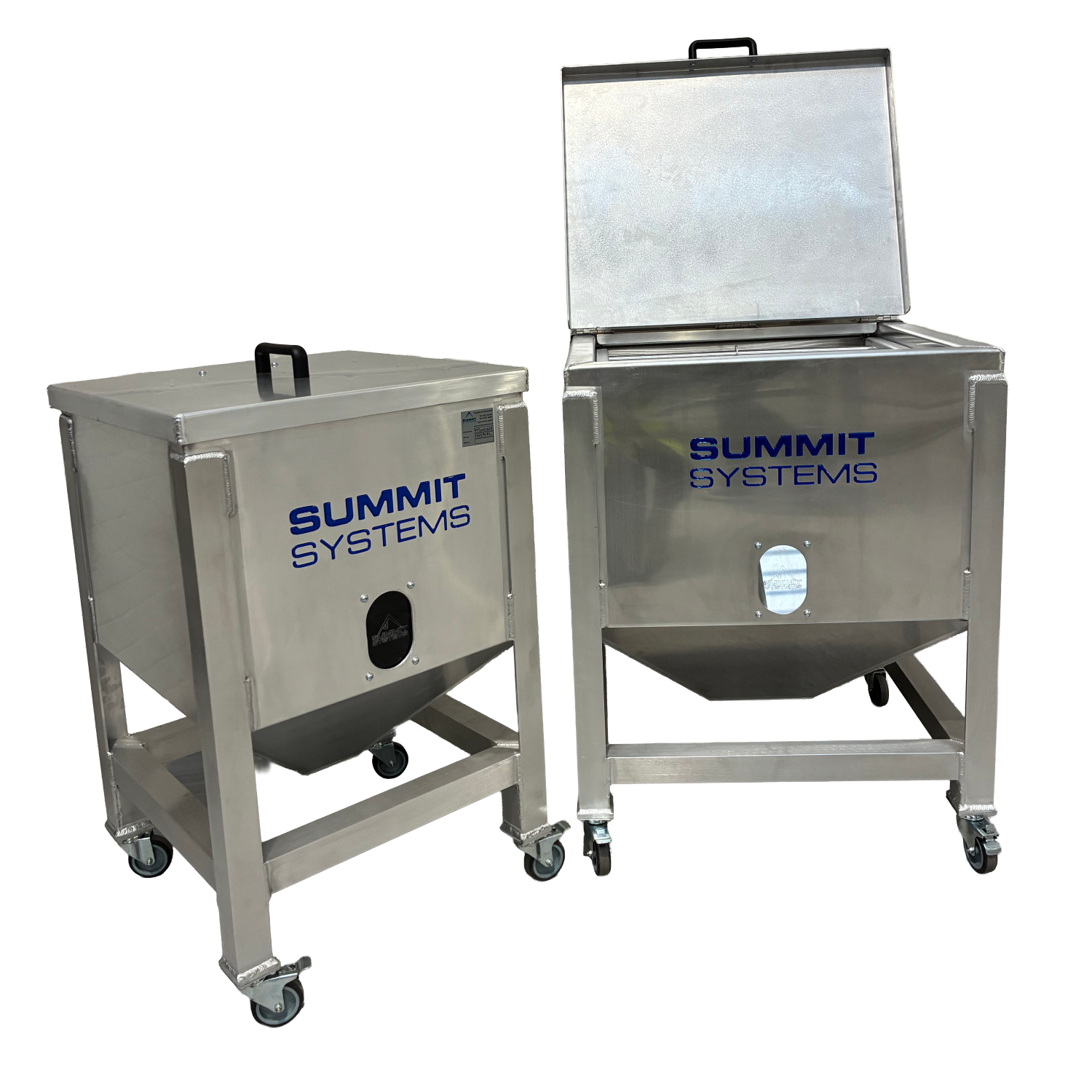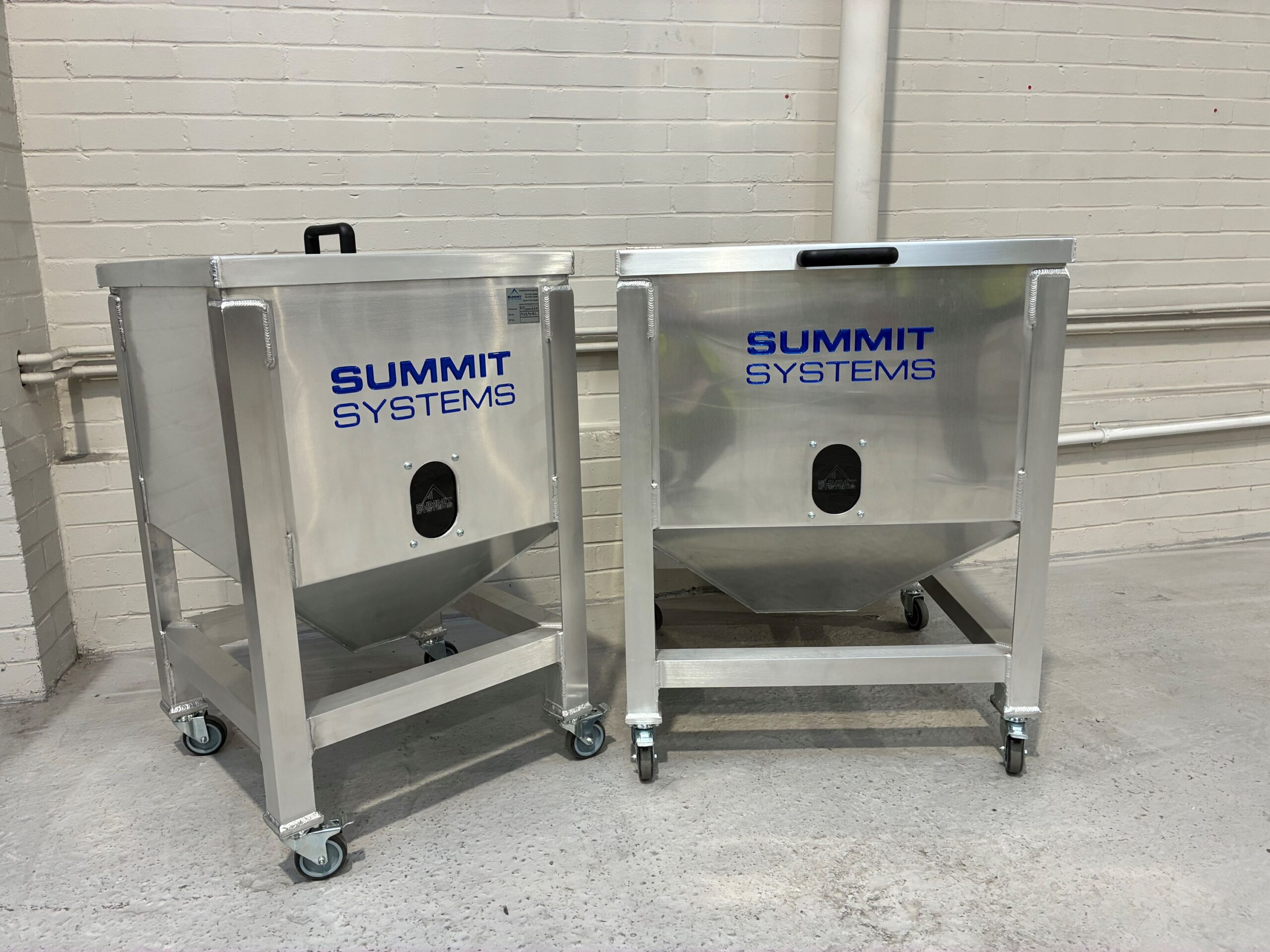 The bins are designed with a focus on ease of use, featuring clear viewing panels for quick material level assessments, large access doors for convenient material loading and unloading, and sturdy, easy-to-manoeuvre structures that facilitate optimal workflow integration. Available in multiple sizes, these bins cater to diverse storage needs and operational scales, making them an essential asset for any plastics processing facility. Each bin is manufactured in-house at the Summit Systems Fabrications department, ensuring the highest standards of quality and craftsmanship.